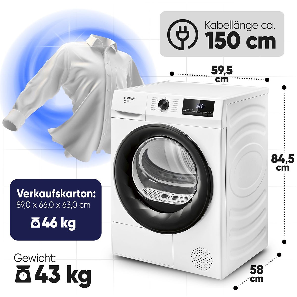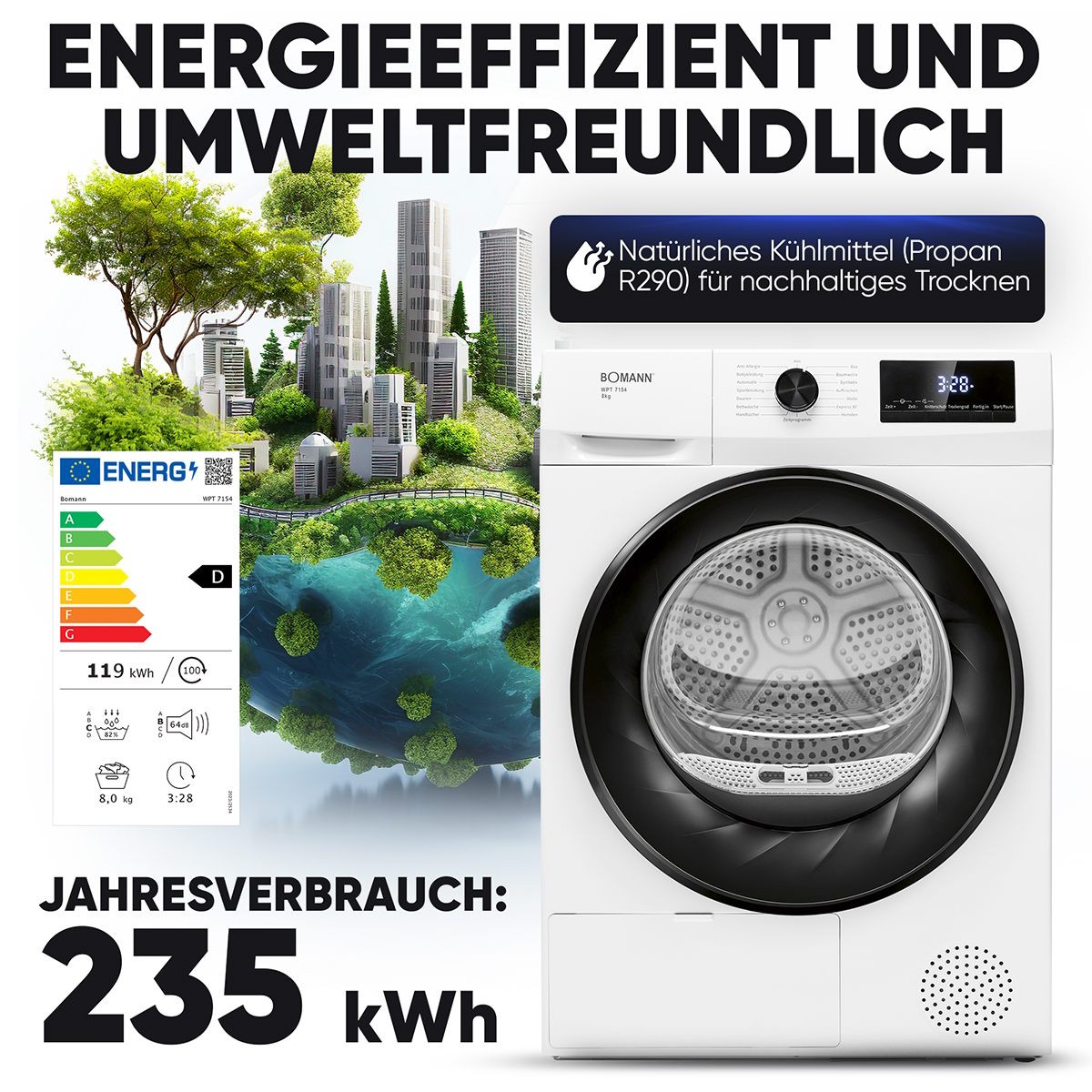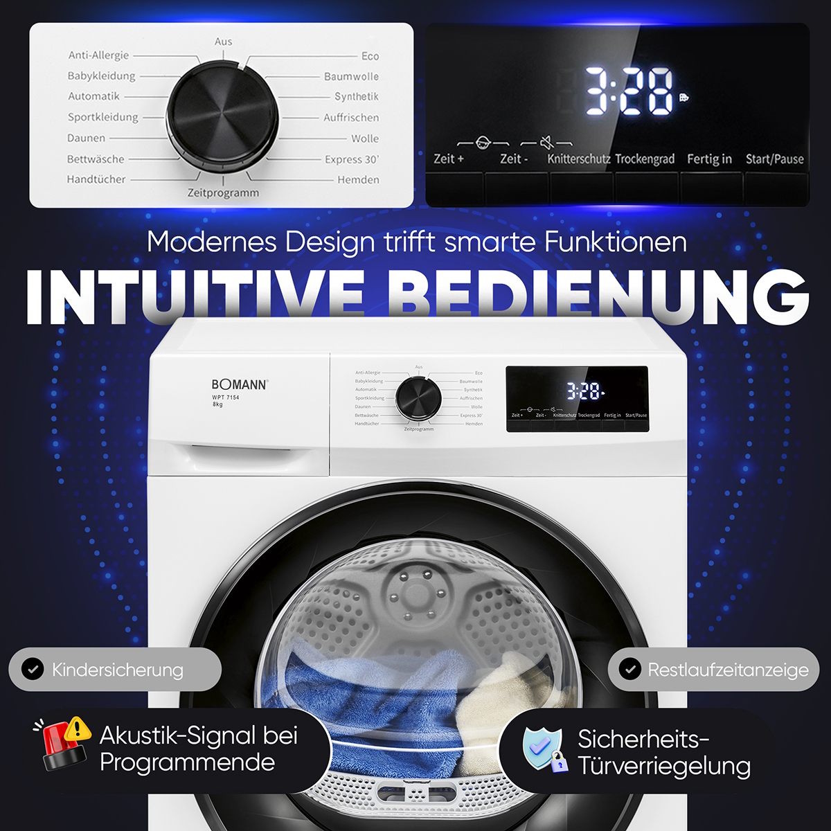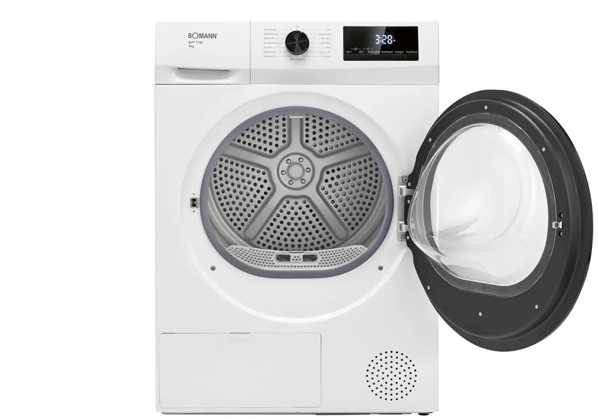 Der Bomann WPT 7154 kombiniert moderne Wärmepumpentechnologie mit einem markanten Design in edlem Weiss. Mit 8 kg Fassungsvermögen ist er der ideale Partner für Familien, die Wert auf energieeffizientes Trocknen und intuitiven Bedienkomfort legen.