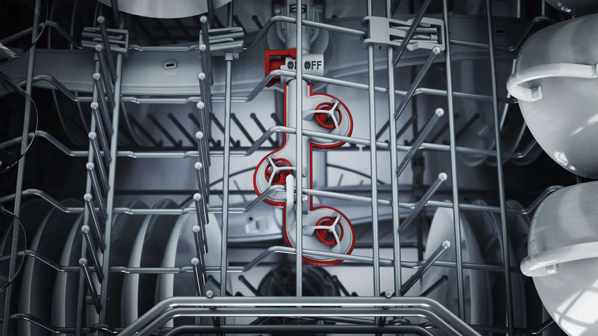 Hartnäckige Verschmutzungen im Oberkorb gehören der Vergangenheit an. Die Extra Clean Zone sorgt mit drei rotierenden Wasserdüsen für eine besonders gründliche Reinigung. Ganz ohne mehr Reinigungsmittel oder höhere Temperaturen wird selbst Eingetrocknetes mühelos sauber.