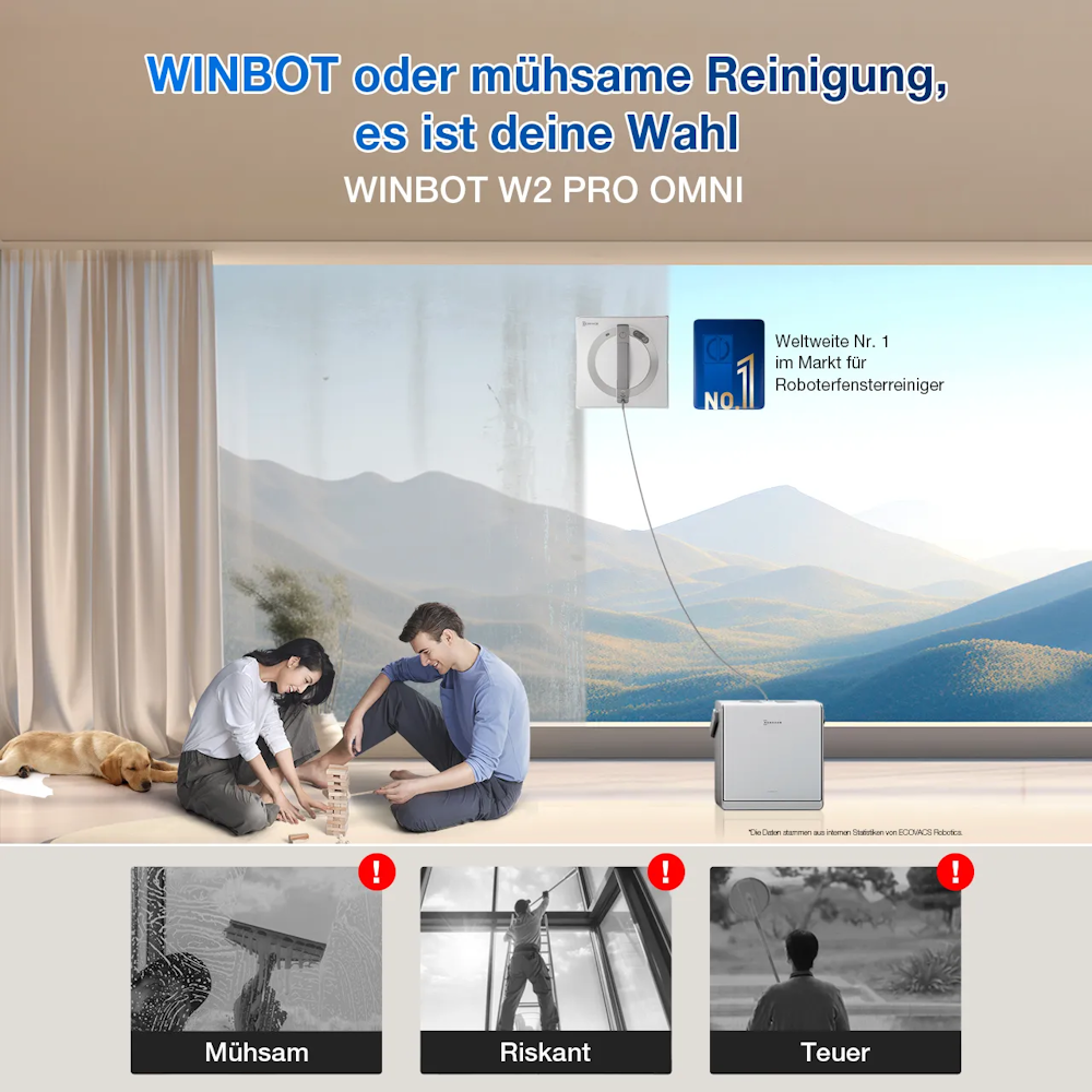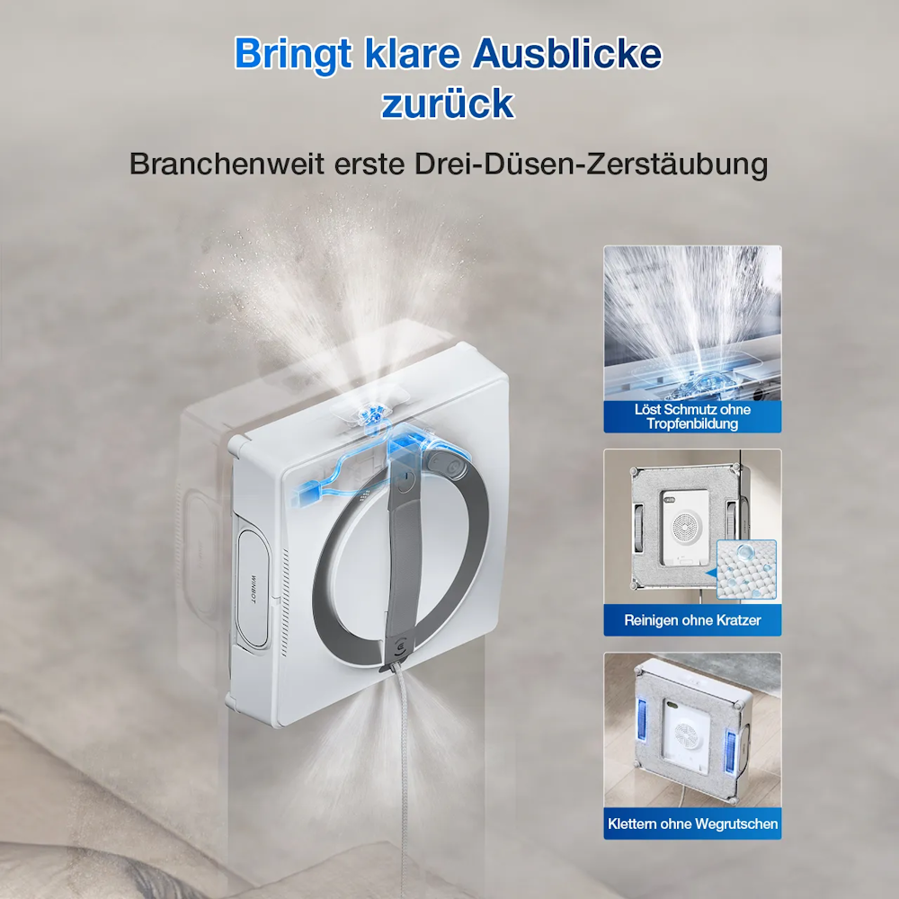 Vergessen Sie Kabelsalat und gefährliche Manöver auf der Leiter. Der WINBOT W2 PRO OMNI definiert Fensterreinigung neu. Ausgestattet mit der ersten tragbaren OMNI-Station und einem hochentwickelten Sprühsystem, sorgt er für streifenfreien Glanz auf allen flachen Glasflächen – von raumhohen Panoramafenstern bis hin zu rahmenlosen Duschwänden.