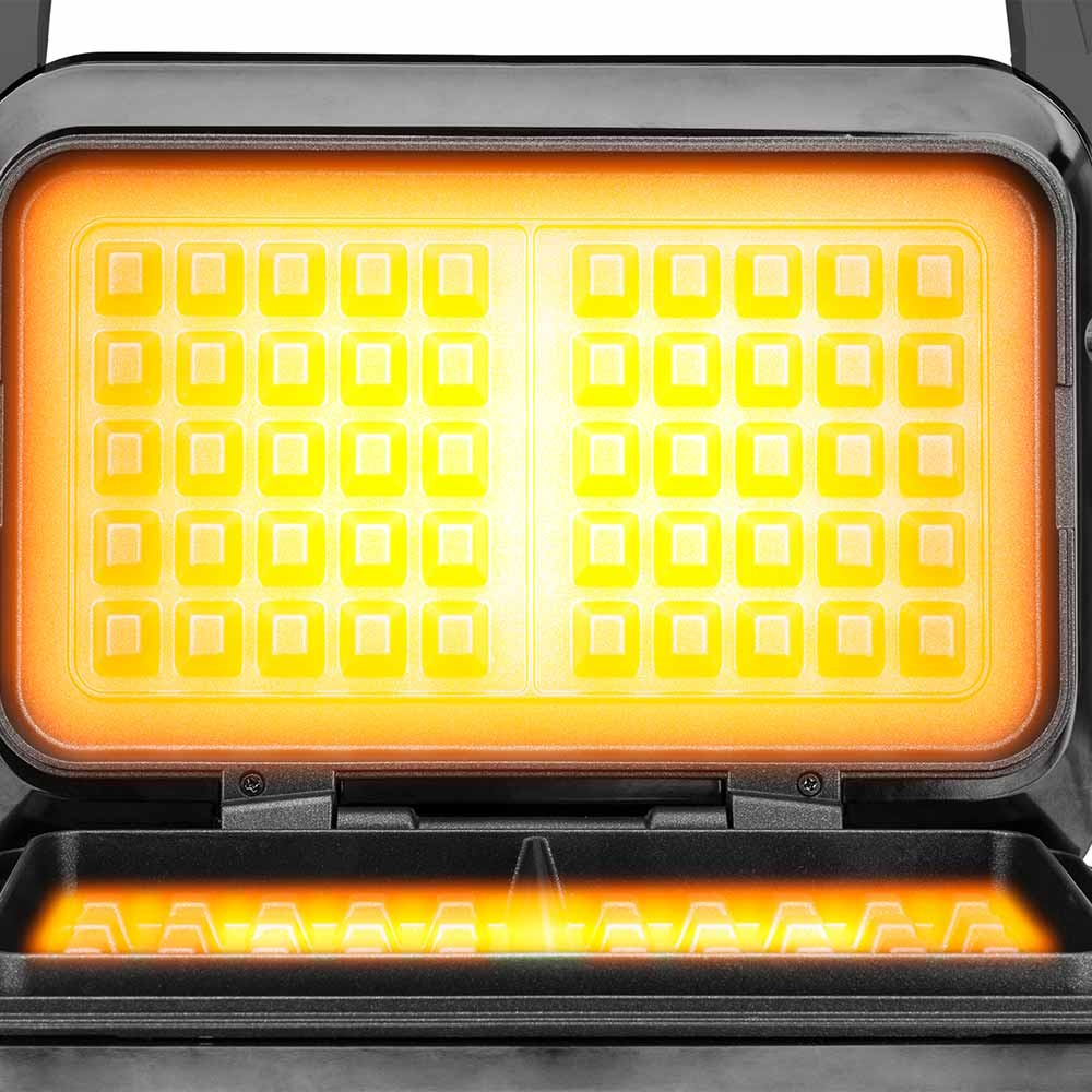 - Antihaftbeschichtung & Überlaufschutz: Die hochwertig beschichteten Heizplatten verhindern Ankleben, während die breite Teig-Auffangrinne dafür sorgt, dass Ihre Arbeitsfläche sauber bleibt.