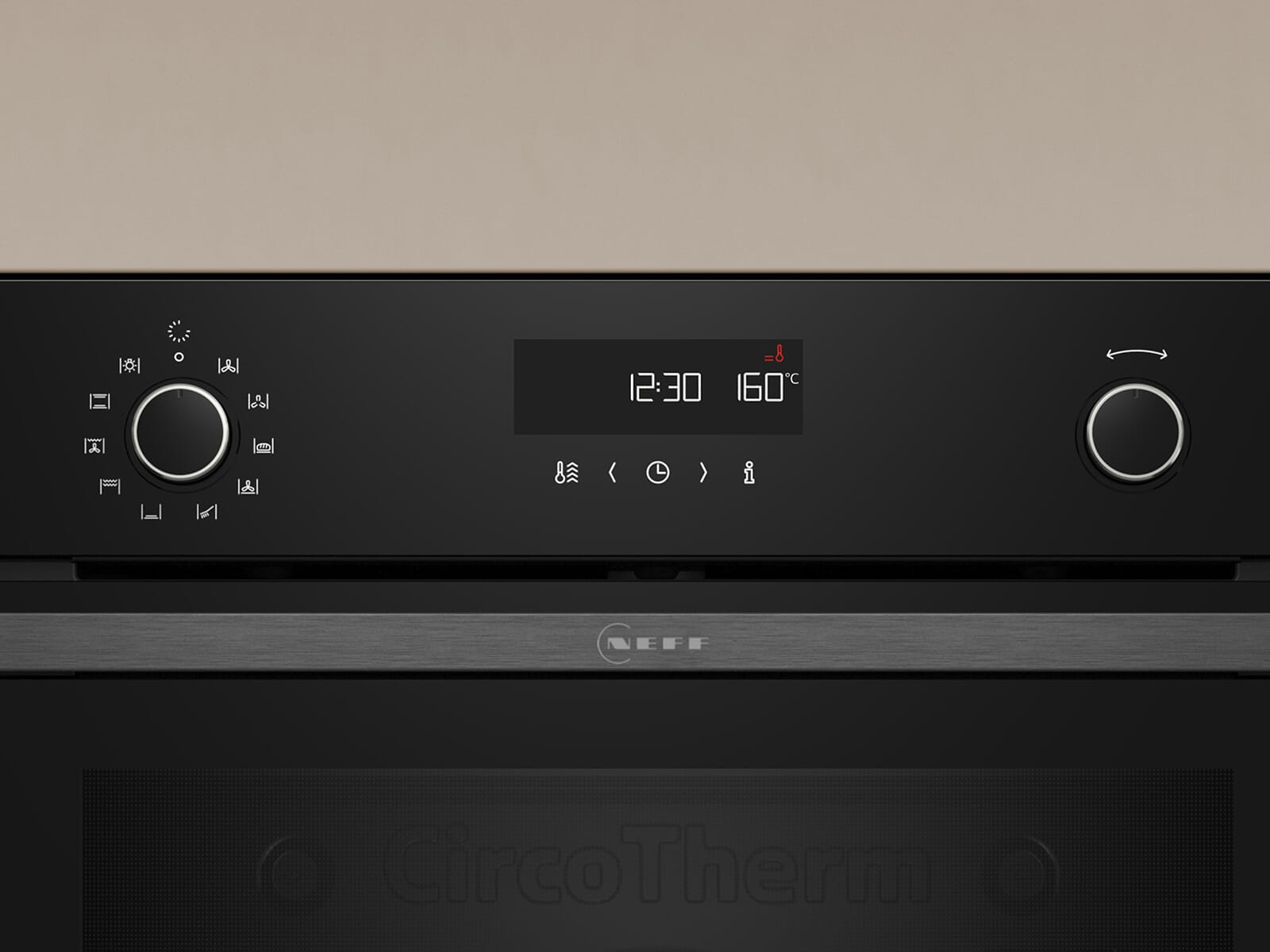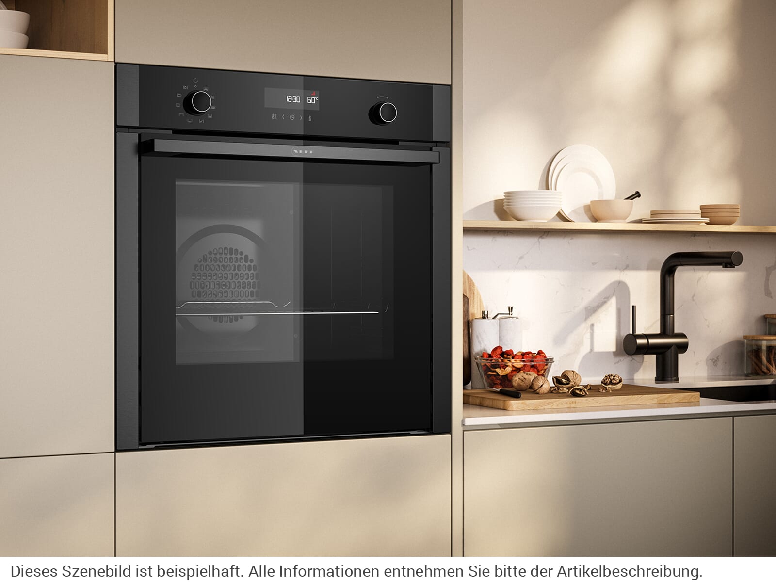Neff B64FT33N0 Einbau-Backofen – FlexDesign & Dampf für perfekte Kochergebnisse Produkt Highlights 17,27 cm (6.8')' Premium Full Touch TFT-Display: einfach zu bedienende und intuitive Benutzeroberfläche für maximalen Komfort. Slide & Hide®: die voll versenkbare Ofentür verschwindet vollständig unter dem Backofen und ermöglicht einen freien und direkten Zugang zu Ihrem Gericht Dämpfen bis 120 °C: gesundes Dämpfen hält den Geschmack und die Nährstoffe in ihren Lebensmitteln. Soft Open & Close: für ein sanftes und leises Öffnen oder Schließen der Ofentür. Multipoint Bratenthermometer: das Bratenthermometer mit drei Messpunkten für gradgenaues und köstliches Braten. Der Dampfbackofen Neff B64FT33N0 stellt auf einem Nutzinhalt von 71 Litern 22 Beheizungsarten zum vielfältigen und kreativen Zubereiten unterschiedlichster Gerichte zur Verfügung. Das einzigartige Heißluftsystem CircoTherm führt mit hoher Geschwindigkeit die Hitze im Backofen gezielt um die Speisen auf den verschiedenen Einschubebenen herum. Auf bis zu vier Ebenen können so unterschiedliche Gerichte gleichzeitig backen, braten und garen – und das ohne Aromenvermischung! Mit Dämpfen bis 120 °C wird schonend gegart, sodass der natürliche Geschmack und die Nährstoffe bei jedem Bissen erhalten bleiben – Fisch und Hühnchen bleiben saftig und Karotten knackig. Das Multipoint-Bratenthermometer mit drei Messpunkten überwacht die Speisen und schaltet den Backofen aus, wenn der gewünschte Gargrad erreicht ist. Das vollfarbige, extra großes 6,8'' Premium Full Touch TFT-Display des B64FT33N0 ist kontrastreich und hochauflösend, damit das Lesen und Navigieren noch einfacher ist. Über Home Connect steht zudem ein Backofen-Assistent mit Sprachsteuerung zur Verfügung. Die Slide&Hide-Backofentür verschwindet beim Öffnen vollständig unter dem Backofen und macht Platz zum unkomplizierten würzen, bepinseln und Gerichte hineinstellen oder wieder herausnehmen. Dabei schwenkt der mitdrehende Türgriff (Slide) beim Öffnen und Schließen der Backofentür in der Handbewegung mit. Das integrierte Reinigungssystem ist hydrolytisch und zum Teil katalytisch, für eine unkomplizierte Reinigung des Innenraums. In puncto Sicherheit bleiben zudem beim B64FT33N0 mit Kindersicherung, Restwärmeanzeige, Türkontaktschalter und automatischer Sicherheitsabschaltung keine Wünsche offen. Heiß dämpfen auf die sanfte Art. Ihr Gemüse soll voller Vitamine bleiben? Mit Dämpfen bis 120 °C garen Sie schonend, sodass der natürliche Geschmack und die Nährstoffe bei jedem Bissen erhalten bleiben. Fisch und Hühnchen bleiben saftig und Karotten knackig. Perfekt! Eco Clean und Easy Clean für einfaches Reinigen. Sie überlegen, ob Sie das saftige Hähnchen zubereiten sollen oder nicht? Mit Eco Clean müssen Sie sich keine Gedanken über die anschließende Reinigung machen. Die Katalyse-Beschichtung nimmt die beim Backen, Braten und Rösten entstehende Fettspritzer auf und zersetzt das Fett bei jedem Backvorgang. Wenn der Ofen hohe Temperaturen erreicht, reinigt sich die Rückwand von selbst. Eco Clean wird ergänzt durch Easy Clean für die Reinigung des Bodens und der Seitenwände des Ofeninnenraums. Smart vernetzte Backöfen machen das Leben einfacher. Sie möchten alle Vorteile Ihres Backofens nutzen? Dann verbinden Sie ihn einfach mit Ihrem Home Connect-Konto und steuern Sie ihn über die App – wie Sie wollen, wann Sie wollen und von wo Sie wollen! Profitieren Sie von dem vielfältigen Angeboten unserer zahlreichen Partner, entdecken Sie inspirierende Rezepte und wissen Sie immer, was in Ihrem Ofen läuft. Personalisieren Sie in der App alles nach Ihren Vorlieben! Um alle Vorteile von Home Connect zu nutzen, verbinden Sie Ihren Backofen einfach mit Ihrem Home Connect-Konto. ¹ Der Neff B64FT33N0 Einbau-Backofen überzeugt durch modernste Technologie, hochwertige Verarbeitung und Flexibilität – ideal für alle, die Wert auf Design, Komfort und herausragende Kochergebnisse legen