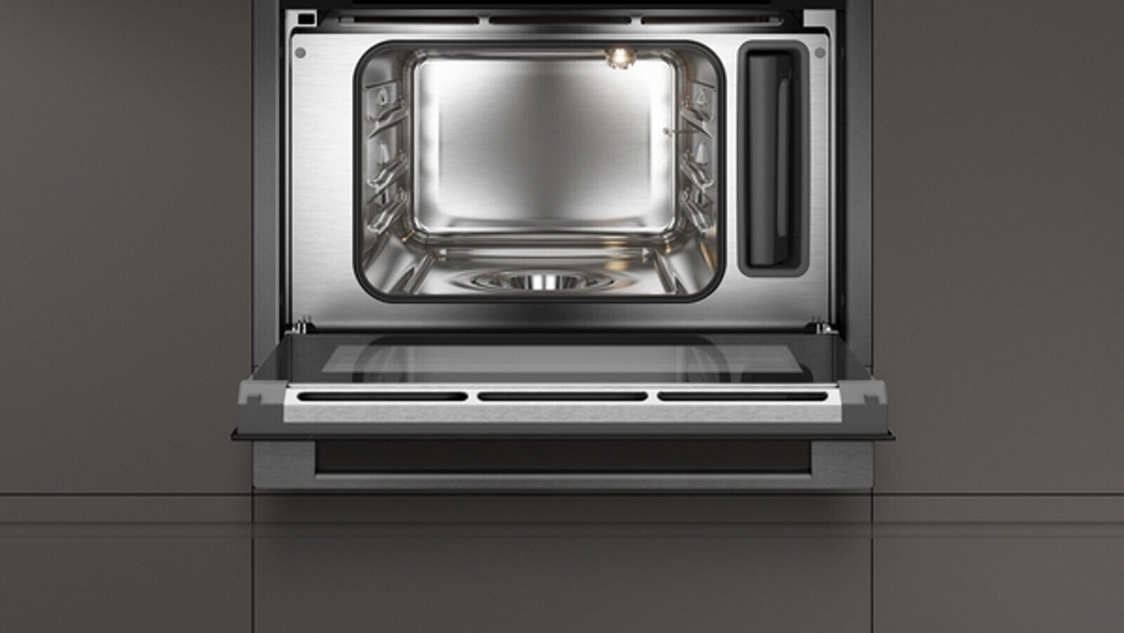 studioLine-Design – Hochwertige Materialien, klare Linien und ein eleganter Look – passt perfekt in exklusive Küchenkonzepte. Produkt Highlight Bräunungssensor mit Kamera und KI: für perfekte Ergebnisse mit deinem gewünschten Bräunungsgrad. TFT-Full-Touchdisplay Pro: großes, farbiges Touchdisplay für komfortable Bedienung. cookControl Pro: alle Gerichte immer perfekt zubereitet. Gerichterkennung: überlasse deinem Backofen die richtigen Einstellungen. activeClean®: Pyrolytische Selbstreinigung. Der Siemens studioLine HN978GQB1 ist ein hochwertiger Kompaktbackofen der Extraklasse, der Mikrowelle, Dampfunterstützung und Pyrolyse-Selbstreinigung in einem Gerät vereint. Mit seinem eleganten Design in Graphitschwarz und seiner intuitiven Bedienung über das hochauflösende TFT-Touchdisplay Plus passt er perfekt in moderne Küchen mit gehobenem Anspruch. Durch die Kombination aus Heißluftbackofen und integrierter Mikrowelle sparen Sie nicht nur Platz, sondern auch Zeit – etwa beim Aufwärmen, Vorbacken oder Garen. Die humidClean- und fullSteam-Funktionen ermöglichen besonders saftige Backergebnisse und punktgenaues Dampfgaren, während die Pyrolyse das Gerät auf Knopfdruck selbstständig reinigt – hygienisch und ganz ohne Chemie. Immer perfekt gebräunte Gerichte. Du möchtest nicht ständig prüfen, ob dein Essen fertig ist? Wähle über den Bräunungssensor einfach deinen gewünschten Bräunungsgrad. Dank künstlicher Intelligenz (KI) und der integrierten Kamera erkennt dein Backofen den Bräunungsgrad deines Gerichts und schaltet sich aus, sobald das gewünschte Ergebnis erreicht ist. Mit der Kamera kannst du von überall aus über dein Smartphone einen Blick in den Backofen werfen. Ein großes Display, für eine intuitive Bedienung. Eine benutzerfreundliche Menüstruktur, die geschmeidige Touchbedienung und das große, kontraststarke Farbdisplay, das aus jedem Winkel leicht zu lesen ist, ermöglichen dir eine einfach und komfortable Bedienung deines Backofens. Die klare Führung durch das umfassende Menü hilft dir dabei das volle Potenzial deines Backofens zu entfalten. Mit KI zur perfekten Einstellung für dein Gericht. Du weißt nicht immer, welches Programm das richtige ist? Dank der Gerichterkennung mit Kamera und Künstlicher Intelligenz weiß dein Backofen, was du kochen möchtest und schlägt dir die idealen Einstellungen vor. Alternativ kannst du die richtigen Einstellungen mit dem Backofenassistenten finden. Entweder mit Sprachsteuerung über Amazon Alexa oder über die Home Connect App. Das spart dir nicht nur Zeit, sondern garantiert auch perfekte Ergebnisse. Intelligente Bedienung mit TFT-Touchdisplay & Home Connect – Steuern Sie Ihren Backofen smart und intuitiv – auch von unterwegs.