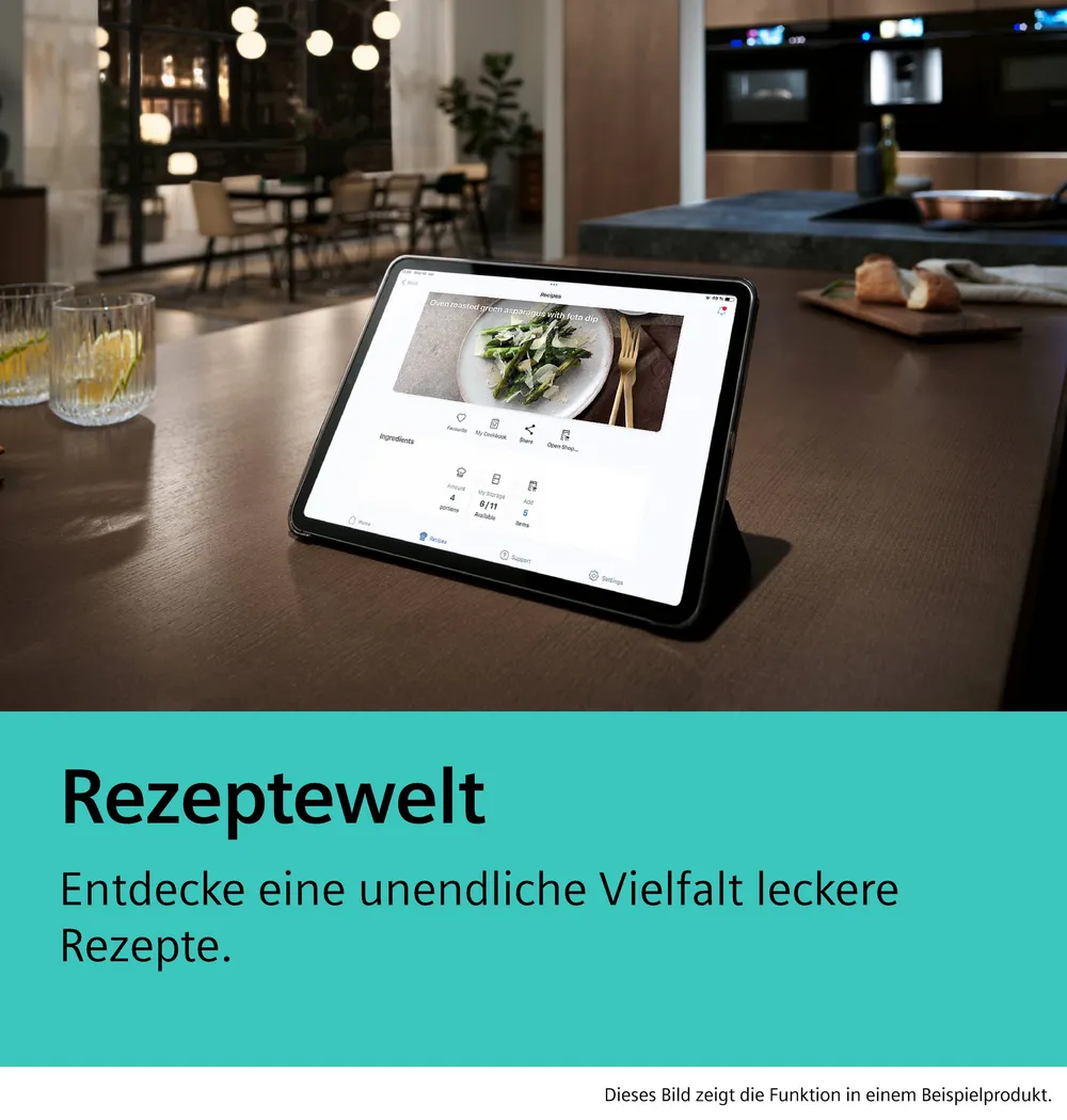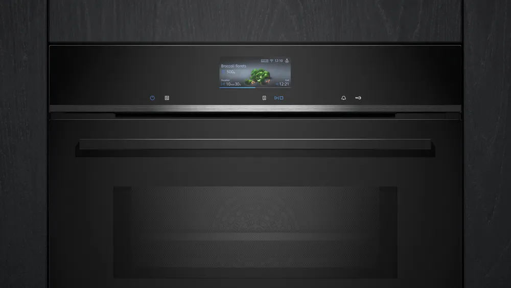 studioLine-Design – Hochwertige Materialien, klare Linien und ein eleganter Look – passt perfekt in exklusive Küchenkonzepte. Produkt Highlight Bräunungssensor mit Kamera und KI: für perfekte Ergebnisse mit deinem gewünschten Bräunungsgrad. TFT-Full-Touchdisplay Pro: großes, farbiges Touchdisplay für komfortable Bedienung. cookControl Pro: alle Gerichte immer perfekt zubereitet. Gerichterkennung: überlasse deinem Backofen die richtigen Einstellungen. activeClean®: Pyrolytische Selbstreinigung. Der Siemens studioLine HN978GQB1 ist ein hochwertiger Kompaktbackofen der Extraklasse, der Mikrowelle, Dampfunterstützung und Pyrolyse-Selbstreinigung in einem Gerät vereint. Mit seinem eleganten Design in Graphitschwarz und seiner intuitiven Bedienung über das hochauflösende TFT-Touchdisplay Plus passt er perfekt in moderne Küchen mit gehobenem Anspruch. Durch die Kombination aus Heißluftbackofen und integrierter Mikrowelle sparen Sie nicht nur Platz, sondern auch Zeit – etwa beim Aufwärmen, Vorbacken oder Garen. Die humidClean- und fullSteam-Funktionen ermöglichen besonders saftige Backergebnisse und punktgenaues Dampfgaren, während die Pyrolyse das Gerät auf Knopfdruck selbstständig reinigt – hygienisch und ganz ohne Chemie. Immer perfekt gebräunte Gerichte. Du möchtest nicht ständig prüfen, ob dein Essen fertig ist? Wähle über den Bräunungssensor einfach deinen gewünschten Bräunungsgrad. Dank künstlicher Intelligenz (KI) und der integrierten Kamera erkennt dein Backofen den Bräunungsgrad deines Gerichts und schaltet sich aus, sobald das gewünschte Ergebnis erreicht ist. Mit der Kamera kannst du von überall aus über dein Smartphone einen Blick in den Backofen werfen. Ein großes Display, für eine intuitive Bedienung. Eine benutzerfreundliche Menüstruktur, die geschmeidige Touchbedienung und das große, kontraststarke Farbdisplay, das aus jedem Winkel leicht zu lesen ist, ermöglichen dir eine einfach und komfortable Bedienung deines Backofens. Die klare Führung durch das umfassende Menü hilft dir dabei das volle Potenzial deines Backofens zu entfalten. Mit KI zur perfekten Einstellung für dein Gericht. Du weißt nicht immer, welches Programm das richtige ist? Dank der Gerichterkennung mit Kamera und Künstlicher Intelligenz weiß dein Backofen, was du kochen möchtest und schlägt dir die idealen Einstellungen vor. Alternativ kannst du die richtigen Einstellungen mit dem Backofenassistenten finden. Entweder mit Sprachsteuerung über Amazon Alexa oder über die Home Connect App. Das spart dir nicht nur Zeit, sondern garantiert auch perfekte Ergebnisse. Intelligente Bedienung mit TFT-Touchdisplay & Home Connect – Steuern Sie Ihren Backofen smart und intuitiv – auch von unterwegs.