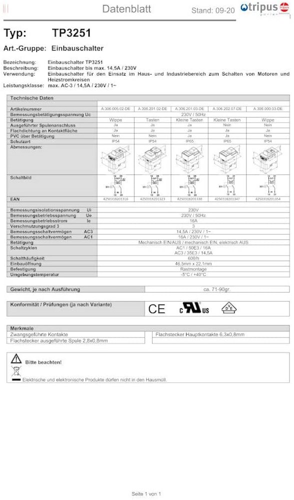 Tripus TP3251-71: Nullspannungsschalter mit Spulenausführung – Maximale Sicherheit bei Stromausfall Der Tripus TP3251-71 Nullspannungsschalter ist ein unverzichtbares Sicherheitselement für Ihre Elektrowerkzeuge und Maschinen. Er wurde speziell entwickelt, um eine maximale Unfallprävention zu gewährleisten, indem er das automatische Wiederanlaufen von Geräten nach einem Stromausfall oder Spannungsabfall effektiv verhindert. Dieses Modell verfügt über eine ausgeführte Spule (UC 230V/50Hz) und ist ideal als zuverlässiger Ersatzschalter oder für den Neueinbau in Anwendungen mit erhöhten Sicherheitsanforderungen. Dank der robusten Bauweise, der Schutzart IP 65 und der einfachen Snap-In Montage ist dieser Maschinenschutzschalter die perfekte Lösung für raue Umgebungen. Er wird häufig in Geräten wie Betonmischern, Bohrmaschinen, Trennschleifern und anderen motorbetriebenen Werkzeugen eingesetzt. Qualität by Tripus bürgt für die Einhaltung höchster Normen (VDE 0660, DIN EN 60947). Sicherheitsmerkmale & Vorteile: Ihr Maschinenschutzschalter Zuverlässige Unterspannungsauslösung (NVS) Der Kern des TP3251 ist der Schutz vor unkontrolliertem Wiederanlauf. Fällt die Spannung ab, wird die Stromzufuhr sofort unterbrochen. Der Schalter bleibt in der "Aus"-Position und muss nach Wiederherstellung der Stromversorgung manuell betätigt werden. Das schützt den Bediener optimal vor Verletzungen. Hohe Belastbarkeit und Schutzart IP 65 Mit einem konventionellen thermischen Strom von 16 A und einem Schaltvermögen von 230V / 16A (AC-1) ist dieser Einbauschalter extrem leistungsfähig. Die Schutzart IP 65 garantiert Schutz gegen Staubablagerungen und Spritzwasser – essentiell für den harten Baustellen- oder Werkstatteinsatz. Einfache Installation dank Snap-In Die "Snap-In" Montage in der Einbauöffnung (ca. 46,5 \22,2\mm) ermöglicht eine schnelle und sichere Installation. Die Flachdichtung sorgt für den nötigen Schutz gegen Feuchtigkeit an der Einbaufläche. Die Hauptanschlüsse erfolgen über Flachsteckanschlüsse 6,3 x 0,8 mm. Ihre Vorteile im Überblick: Sicherheit für Ihre Elektrowerkzeuge Maximale Arbeitssicherheit: Verhindert das selbsttätige Wiedereinschalten nach Spannungsausfall (NVS-Funktion). Universeller Einsatz: Perfekt als Ersatzschalter für Betonmischer, Bohrmaschinen und diverse Motoren. Hoher Schutzgrad: IP 65 gegen Spritzwasser und Staub – ideal für Werkstatt und Baustelle. Schnelle Montage: Bequeme und sichere Snap-In Befestigung. Ausführung mit Spule: Bemessungsbetätigungsspannung UC = 230V / 50Hz. Qualität und Normen: Hergestellt in Europa Made in Europe by Tripus, konform mit VDE 0660 und DIN EN 60947. Technische Details: Tripus TP3251-71 Produkttyp: Nullspannungsschalter / Maschinenschutzschalter Hersteller/Modell: Tripus TP3251-71 Schaltfunktion: 0 - 1 (EIN/AUS) Kontakte: 2 Schließer Nennstrom: 16 A Schaltvermögen AC-1 (230V): 16 A Schaltvermögen AC-3 (230V): 14,5 A Betätigungsspannung (UC): 230V / 50Hz (mit Spule) Anschlüsse: Flachsteckanschlüsse 6,3 \0,8\mm Einbauart: Snap-In (Einbauöffnung ca. 46,5 \ 22,2\mm) Frontschutzart: IP 65 Material / Farbe: PA / Schwarz GTIN/EAN: 4250318201286 Schützen Sie Ihre Geräte und Mitarbeiter mit dem Original Tripus Schalter! Setzen Sie auf den Tripus TP3251-71 – die Norm für Maschinensicherheit. Jetzt bestellen und sicher arbeiten!